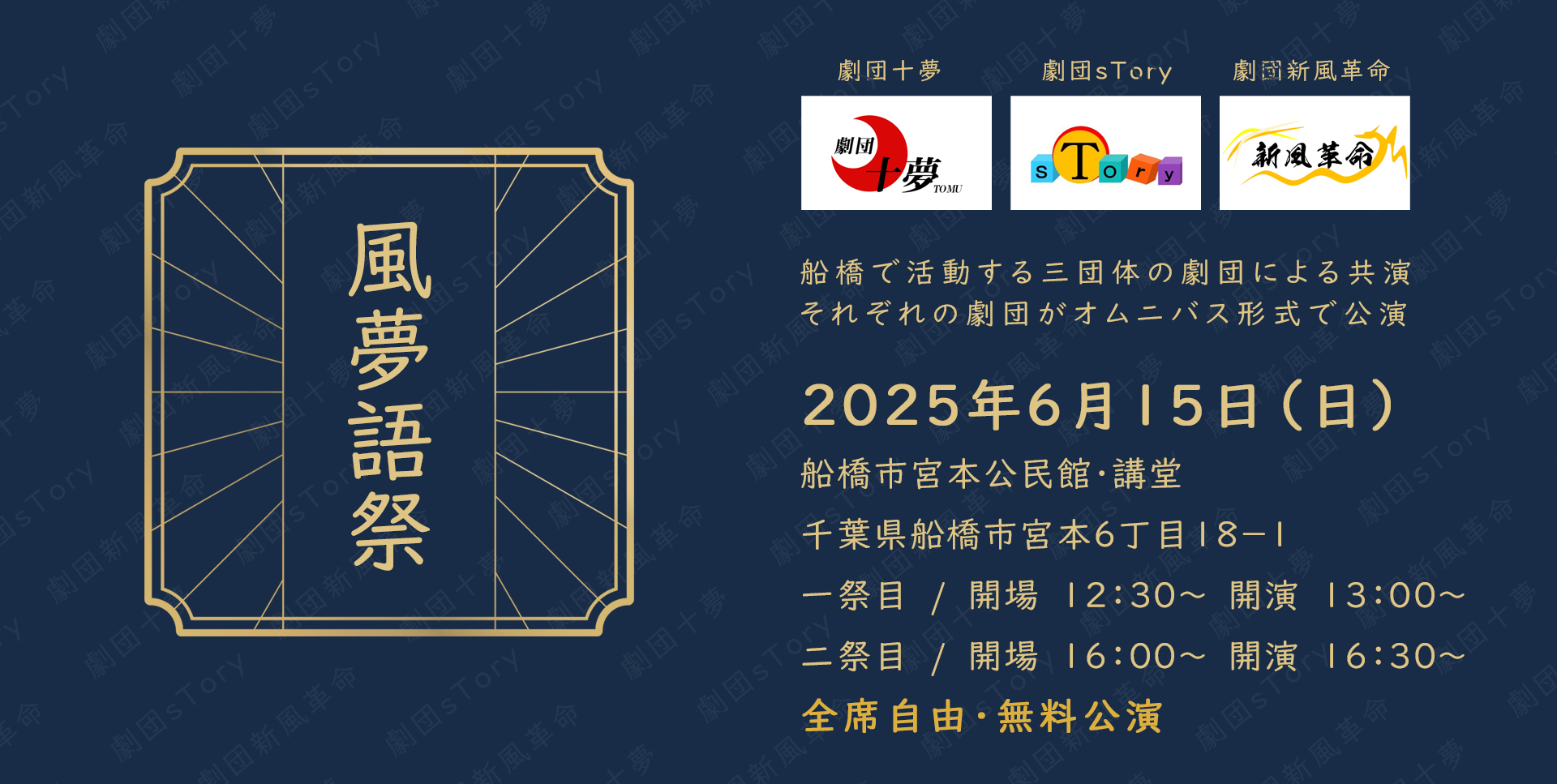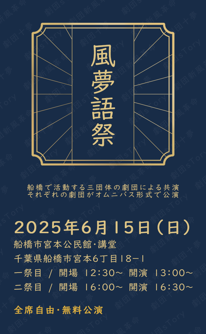 二祭目16:30~16:45 – ショートコント16:45~17:25 – 劇団十夢17:25~17:35 – 休憩17:35~18:20 – 劇団sTory18:20~18:30 – 休憩18:30~19:05 – 劇団新風革命